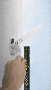 Take a credit card/ruler or a similar flat object and position it against the window frame so that it slightly overlaps the glass. Then, using a tape measure, check the gap between the glass and the card. This depth typically falls between 18mm and 30mm. You’ll need this measurement when choosing the correct beading depth for your bracket size when ordering your blinds.